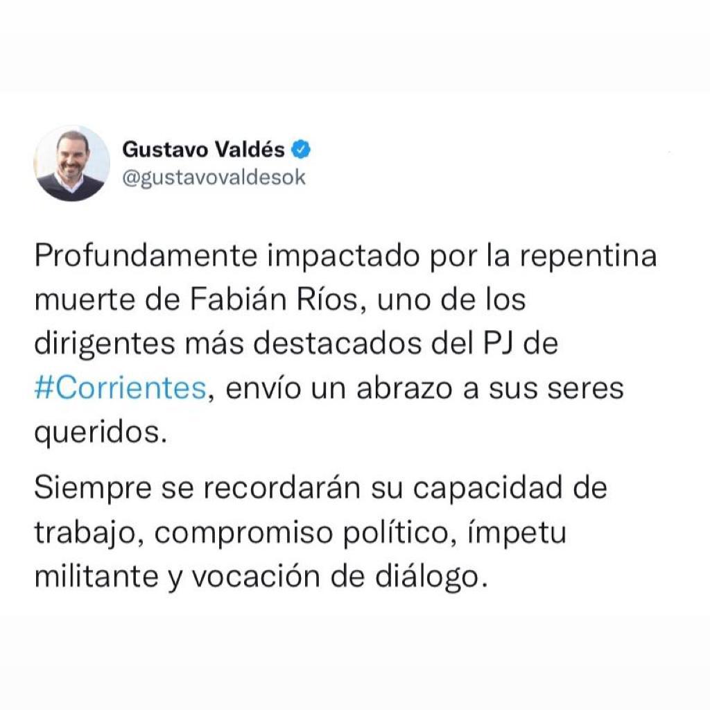 Apenas conocida la noticia del fallecimiento del ex intendente de la ciudad de Corrientes, Fabián Ríos, el gobernador Gustavo Valdés expresó su conmoción por el luctuoso hecho y le dedicó palabras de reconocimiento.