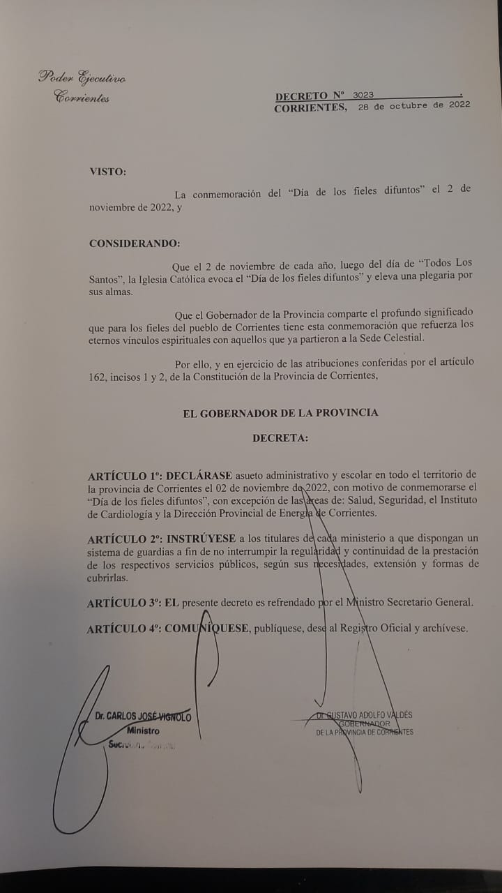 Mediante el decreto N°3023, el gobernador Gustavo Valdés declaró para el próximo miércoles 2 de noviembre, el asueto administrativo y escolar en todo el territorio de la provincia de Corrientes al conmemorarse el “Día de los Fieles Difuntos”.