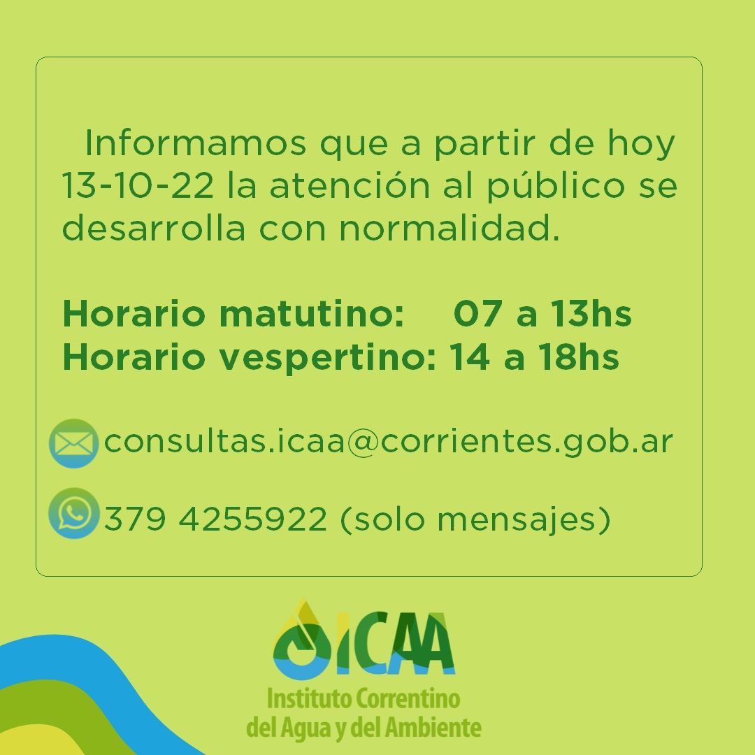 El Instituto Correntino del Agua y del Ambiente (ICAA) informó que a partir del día de la fecha la atención al público será normal, en horario matutino de 07:00 a 13:00 horas y en horario vespertino de 14:00 a 18:00 horas.