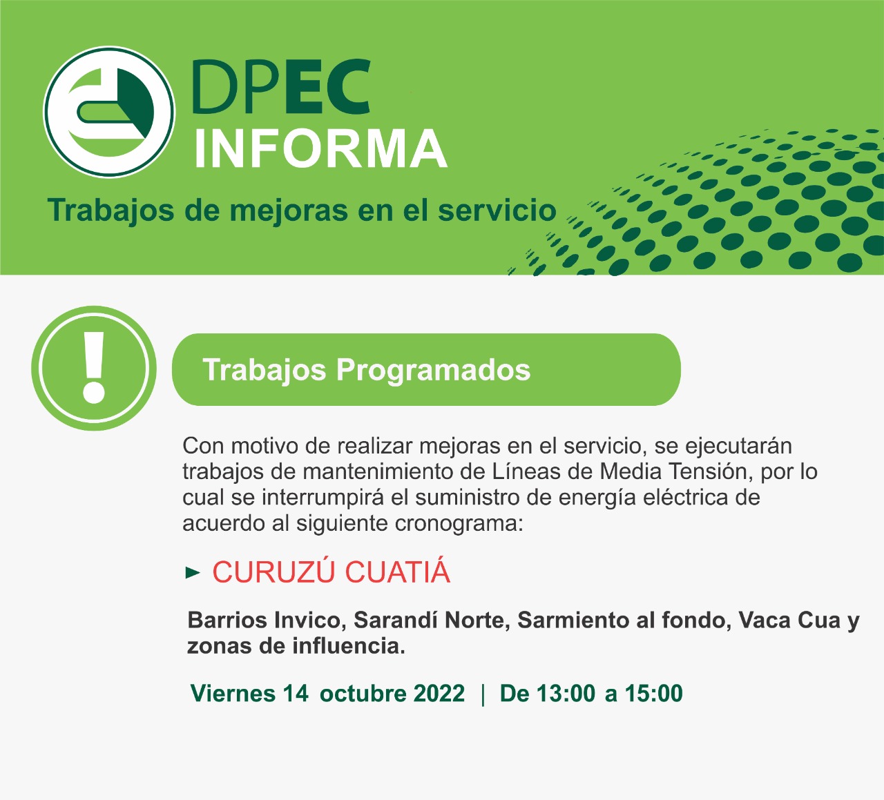 La Dirección Provincial de Energía de Corrientes (DPEC) informa que con motivo de realizar mejoras en el servicio, se ejecutarán tareas de mantenimiento de Líneas de Media Tensión (LMT), por lo cual se interrumpirá el suministro de energía eléctrica en la localidad de Curuzú Cuatiá, este viernes 14 de 13 a 15, en los barrios INVICO, Sarandí Norte, Sarmiento al fondo, Vaca Cuá y zonas de influencia.