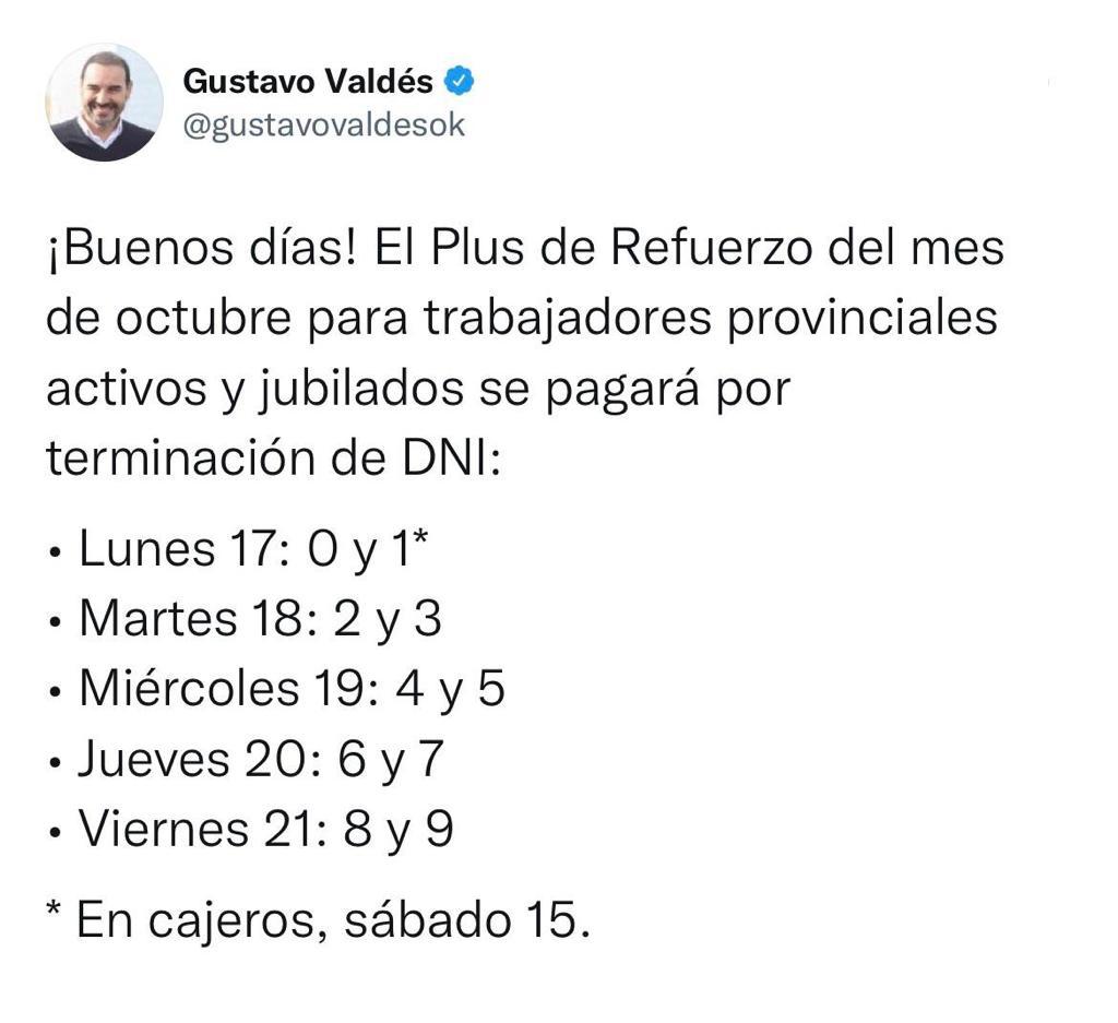 Tal lo adelantó el gobernador Gustavo Valdés, el pago del Plus de Refuerzo de septiembre comienza este lunes 17, día que cobrarán los agentes activos, jubilados y pensionados, con sus Documento Nacional de Identidad terminados en 0 y 1; este tramo estará disponible a través de los cajeros automáticos del Banco de Corrientes SA desde el sábado 15.