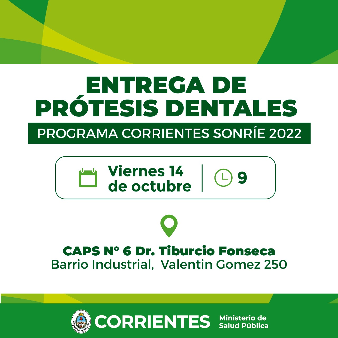 En el marco del Programa Corrientes Sonríe 2022, el Gobierno provincial, a través del Ministerio de Salud Pública, realizará este viernes a las 9 la entrega de prótesis dentales a pacientes de los Centros de Atención Primaria de la Salud (Caps). La actividad estará presidida por el ministro de Salud Pública, Ricardo Cardozo y se llevará a cabo en el Caps N° 6 Dr. Tiburcio Fonseca, del barrio Industrial, ubicado en Valentín Gómez 250.