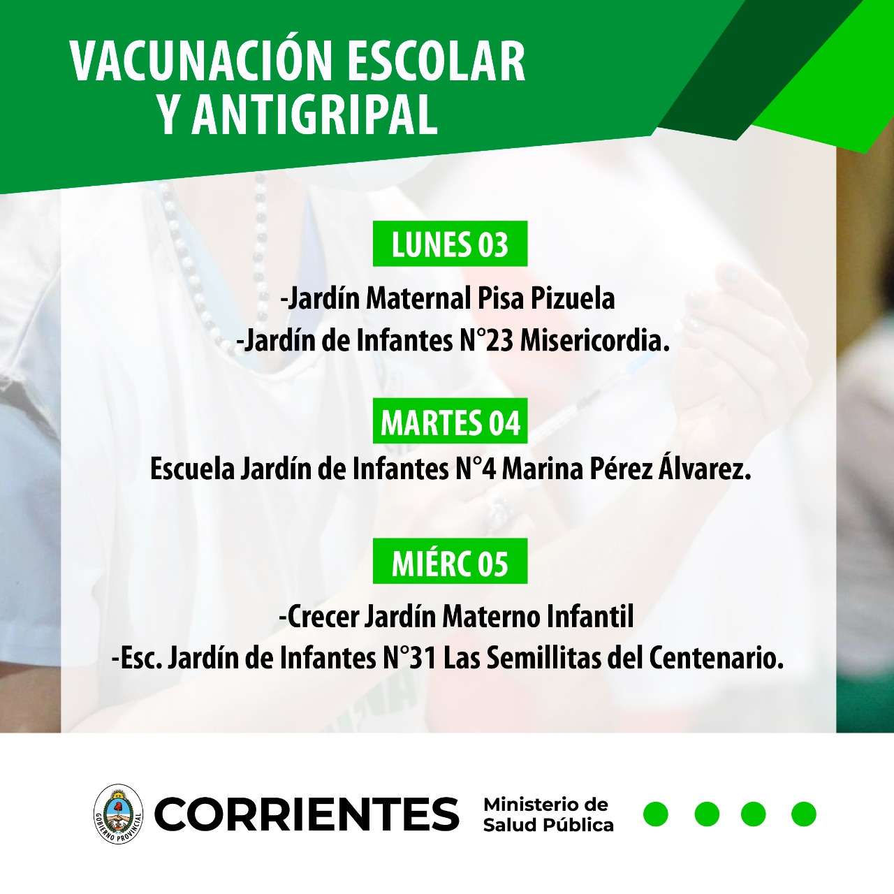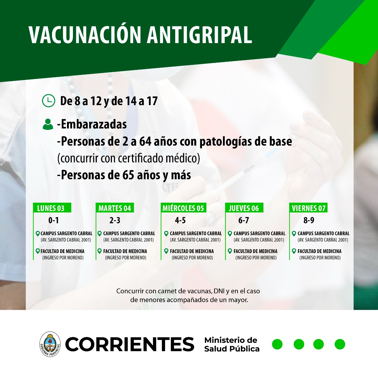 Desde este lunes hasta el viernes, de 8 a 12 y de 14 a 17, la Campaña de Vacunación Antigripal continúa con el personal de salud, embarazadas (cualquier mes de gestación), personas entre 2 a 64 años con factores de riesgo (presentar certificación que avale dicha condición) y para los mayores de 65 años.