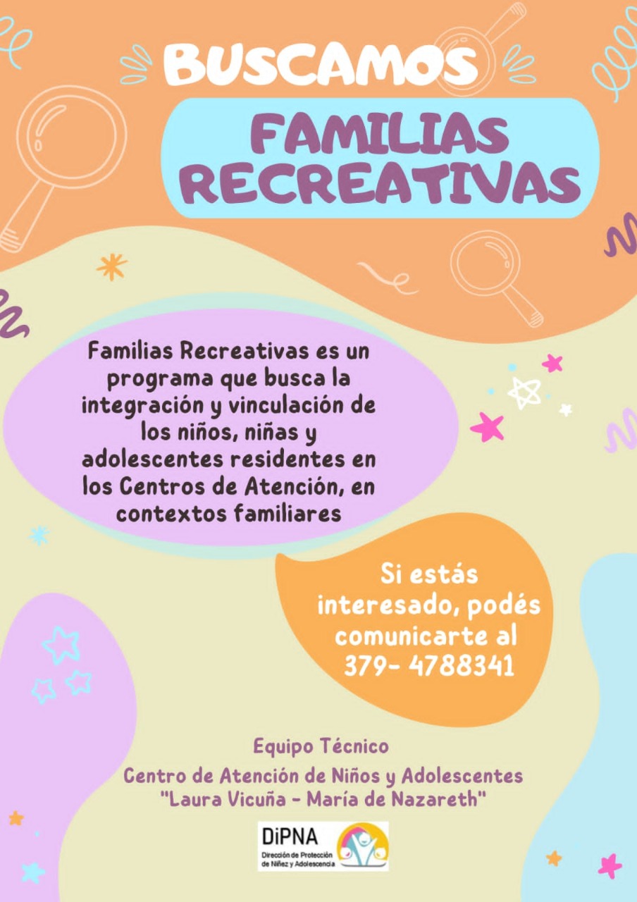 Familias Recreativas es un programa que busca la integración y vinculación de los niños, niñas y adolescentes residentes en los Centros de Atención, en contextos familiares. Quienes estén interesados en formar parte de este proceso importante para el desarrollo de quienes están institucionalizados, deben comunicarse al 3794 788 341.