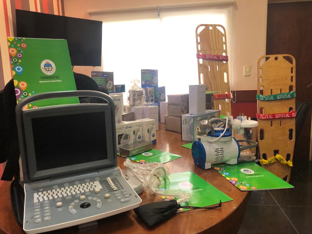 Santo Tomé: 2 ficheros, 3 oxímetros, 2 detectores de latidos fetales, 8 Tensiómetros, 4 sillas, 4 nebulizadores, 6 escritorios, 1 heladera, 1 caja de curaciones, 1 caja circular menor, 1 tambor para insumos grandes, 1 tambor de insumos chico y 1 ecógrafo portátil más un transductor.