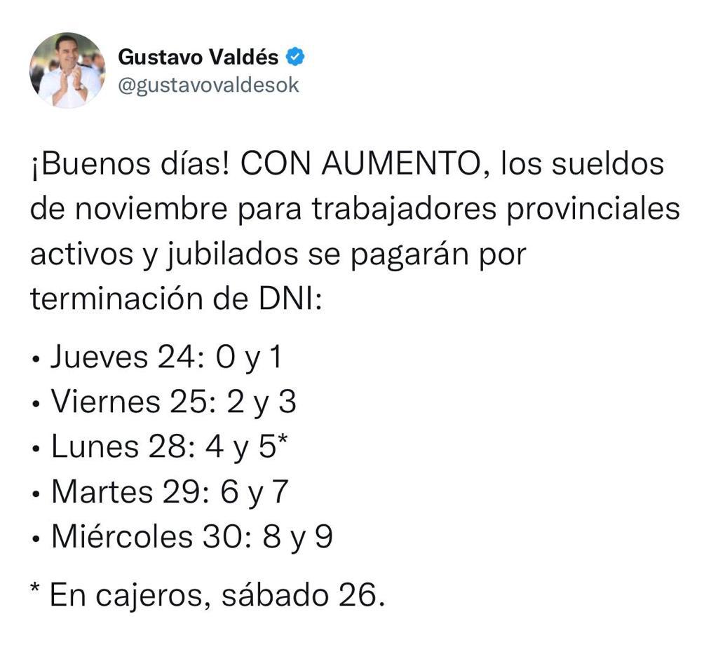 El Gobernador Gustavo Valdés informó cronograma de pagos de sueldos para empleados estatales que iniciará este jueves 24 de noviembre.