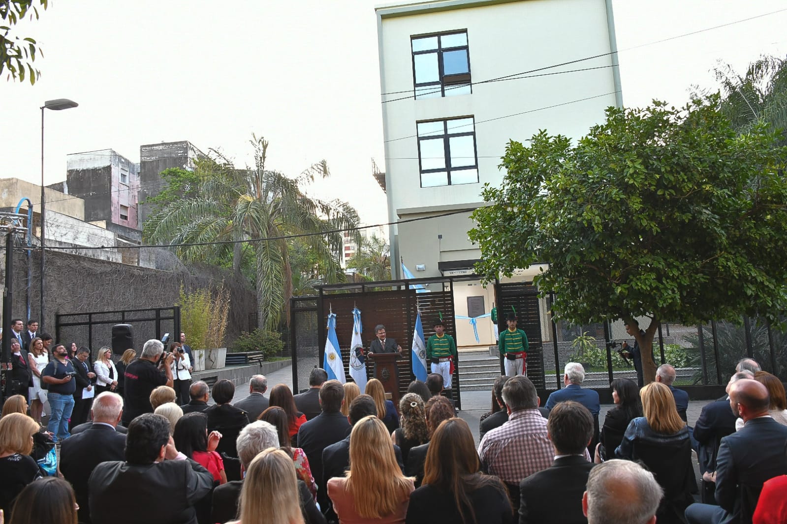 El acto dio inicio a las 18, sobre la acera, frente al moderno edificio, donde se dispusieron sillas para las autoridades e invitados, encabezados por el presidente del Superior Tribunal de Justicia de Corrientes, Eduardo Rey Vázquez, el ministro del STJ, Eduardo Panseri y del Fiscal General, César Sotelo, entre las principales autoridades judiciales. También estuvieron el vicegobernador Pedro Braillard Poccard, el Fiscal de Estado, Horacio Ortega, funcionarios del Gobierno y legisladores provinciales.