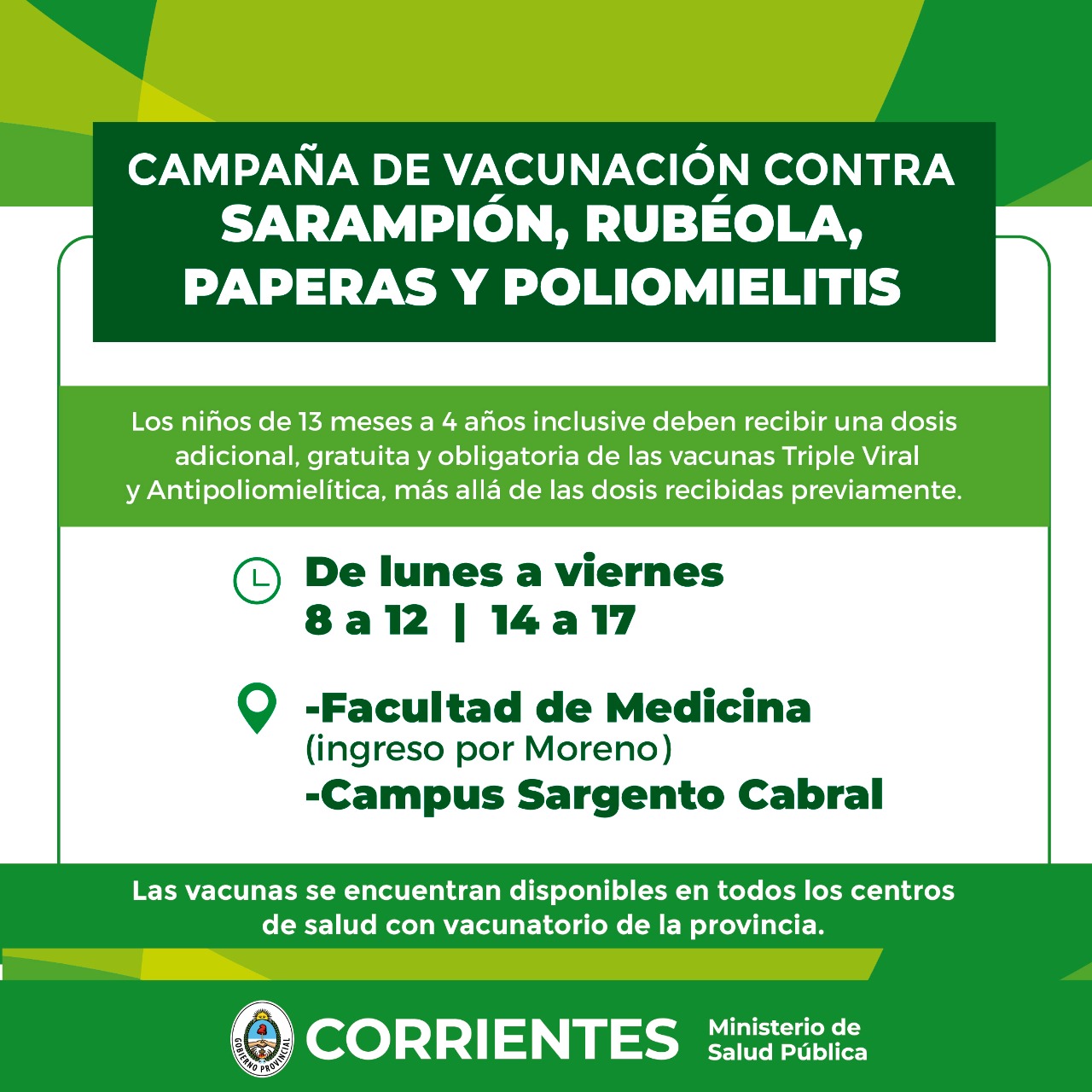 Desde este lunes hasta el viernes, de 8 a 12 y de 14 a 17, la Campaña contra Sarampión, Rubéola, Paperas y Poliomielitis. La Campaña de Vacunación Antigripal continúa con el personal de salud, embarazadas (cualquier mes de gestación), personas entre 2 a 64 años con factores de riesgo (presentar certificación que avale dicha condición) y para los mayores de 65 años.