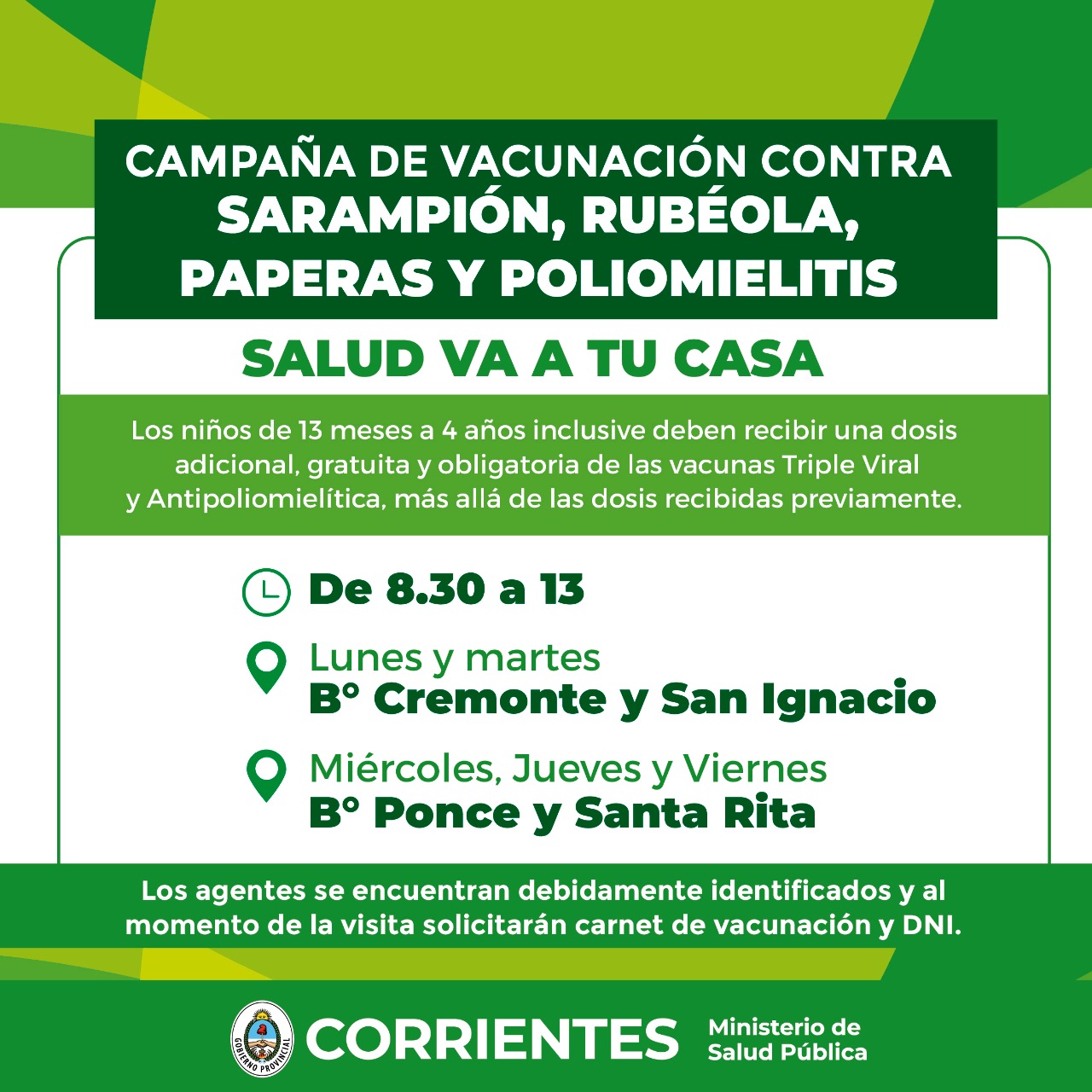 El Ministerio de Salud Pública a través de la Dirección de Inmunizaciones, continúa con la Campaña contra Sarampión, Rubéola, Paperas y Poliomielitis. También siguen las campañas Antigripal 2022 y Covid-19. Además, esta semana la campaña Salud va a tu casa continúa en los barrios.