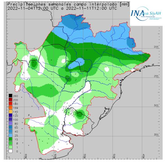 El día 13 de noviembre se registraron lluvias de variada intensidad, cubriendo prácticamente toda la parte de cuenca en nuestro territorio. No se espera un repunte importante en el aporte de los ríos afluentes. La onda de repunte ordinaria originada durante octubre ya se propagó por todo el tramo argentino del río, sosteniendo la condición de aguas medias. En Goya el nivel descendió 0,23 m en la semana. Registra el 13 de noviembre 4,17 metros y un promedio semanal de 4,30 metros (0,16 m de descenso promedio). Promediaría en noviembre 4,10 metros (0,22 metros por encima del promedio desde 1997).