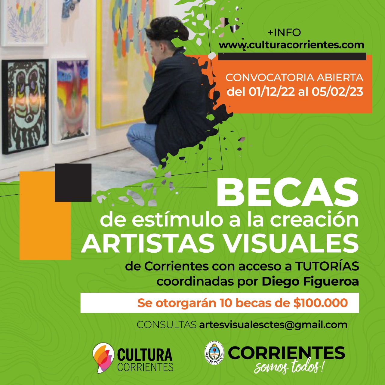 El Instituto de Cultura de Corrientes (ICC), en su política de acompañamiento y fortalecimiento a los artistas, otorgará becas de estímulo a la creación con acceso a tutorías, a 10 artistas visuales residentes en la provincia. Desde hoy, hasta el 5 de febrero, se recibirán las postulaciones. Los seleccionados recibirán $100.000 para el desarrollo creativo de su producción y la compra de materiales e insumos.