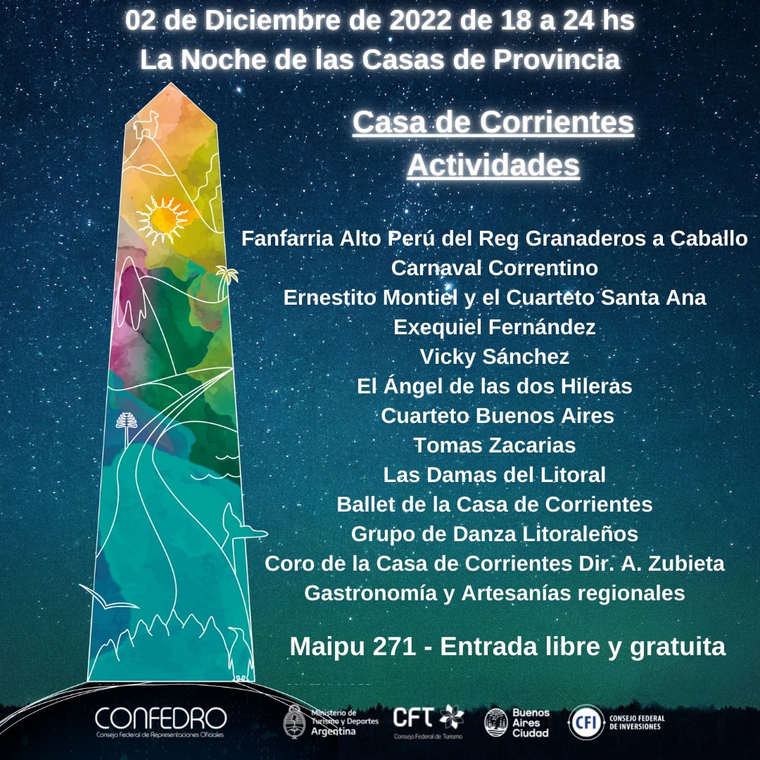 Este viernes 02 de Diciembre la Casa de Corrientes participara de la 10º Edición de la Noche de las Casas de Provincia, evento que organiza el Consejo Federal de Representaciones Oficiales, CONFEDRO, en la Ciudad de Buenos Aires, desde las 18 hs y hasta las 24 hs. con entrada libre y gratuita.