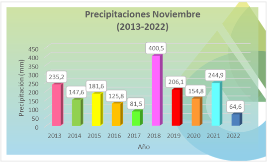 En lo que va del año, hasta el mes de informe, la precipitación acumulada asciende al valor de 902,4 milímetros. En base a los gráficos elaborados en el informe de la Gerencia de Ingeniería del ICAA, el pasado mes de noviembre es el más seco de los últimos 9 años dado que es el que presenta el menor registro de precipitación en la serie de datos comprendida del 2013-2022.