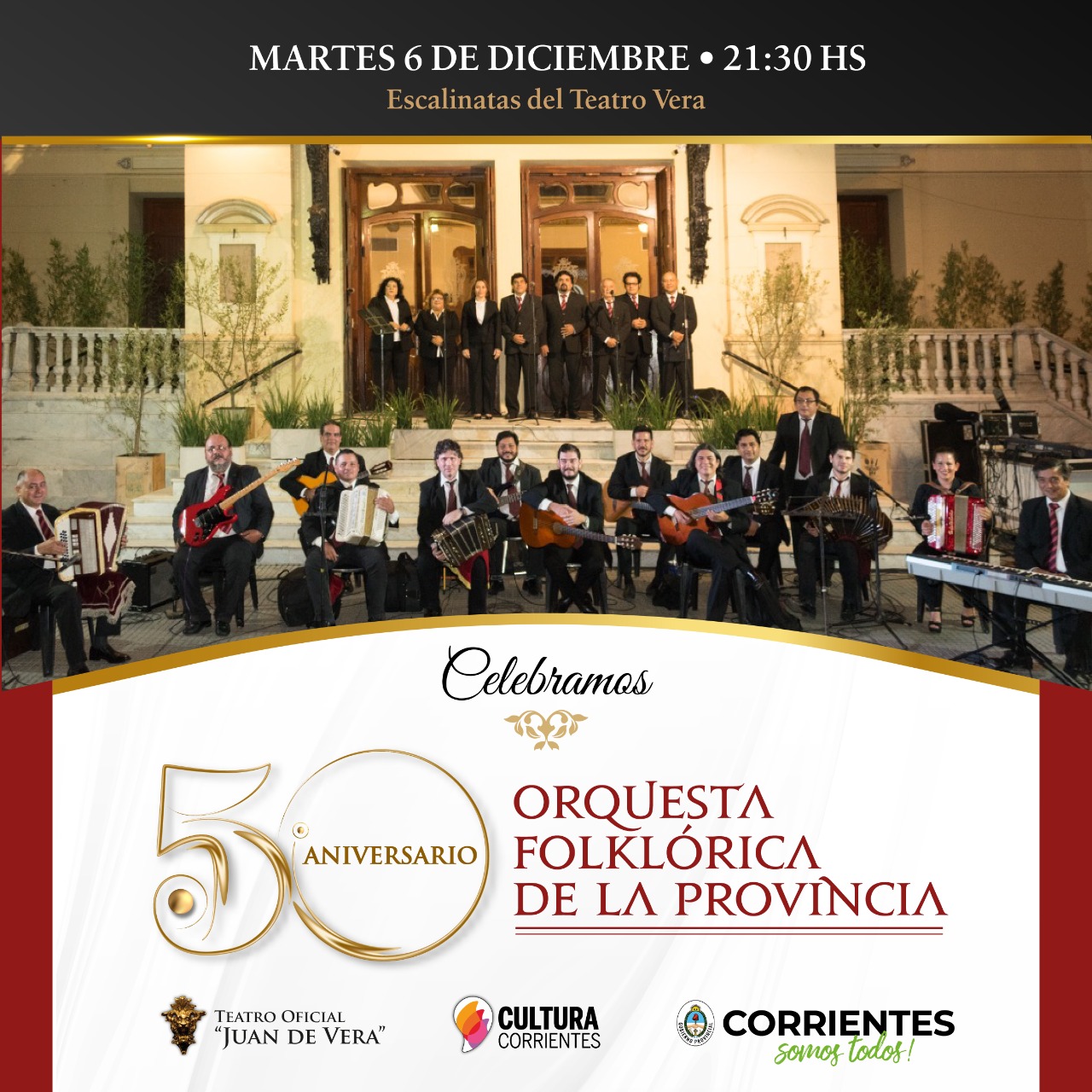 El Gobierno de Corrientes a través del Instituto de Cultura, junto al pueblo correntino, rendirá tributo a la Orquesta Folclórica de la Provincia, por cumplirse 50 años de su creación. Este acto de reconocimiento se hará el martes 6 de diciembre, desde las 21, en las escalinatas del Teatro Vera.