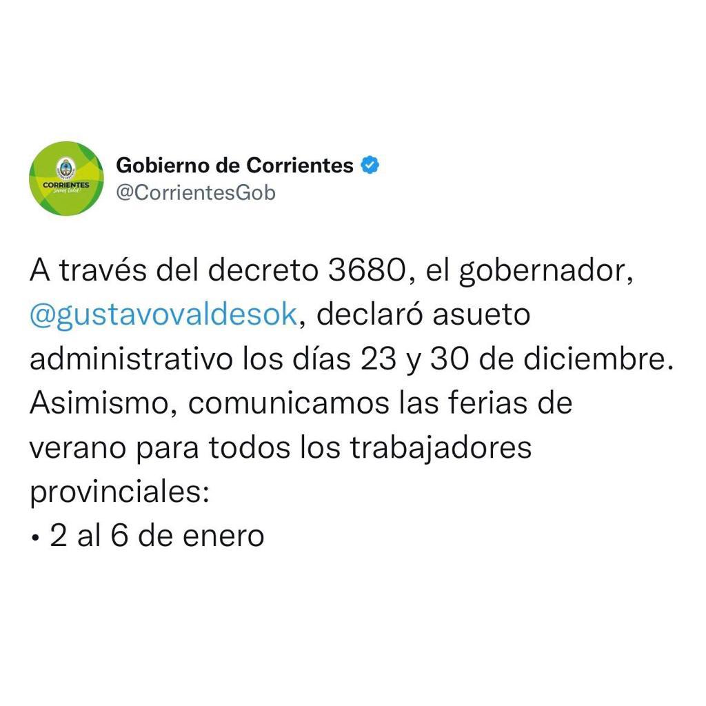 A través del decreto 3680, el gobernador Gustavo Valdés declaró asuetos administrativos en los días 23 y 30 de diciembre, próximos. En tanto, del mismo modo, quedó establecida, del 2 al 6 de enero de 2023, las ferias de verano para todos los trabajadores provinciales, en todas las reparticiones de la Administración Pública provincial central, organismos descentralizados y autárquicos.