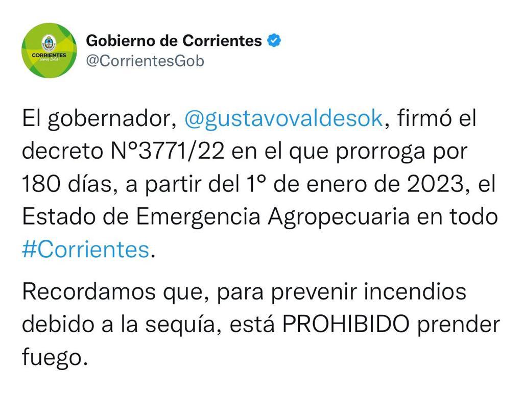 El gobernador Gustavo Valdés a través del Decreto N°3771/22 declaró la prórroga en la jornada de hoy del Estado de Emergencia y/o Desastre Agropecuario por el término de seis (6) meses a partir del 01 de enero de 2023. El mismo es para todas las actividades productivas, abarca a todo el territorio Provincial y se establece debido a la continuidad de las condiciones de sequía y de los daños generados por esta, se resolvió tomar esta medida que rige en la Provincia de Corrientes.