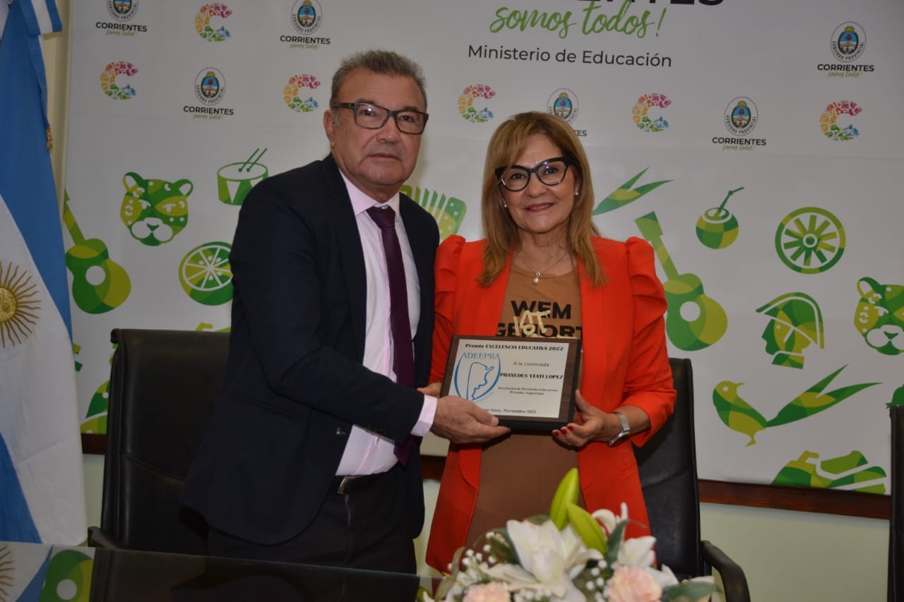 En este marco el referente de CAIEP agradeció a la ministra López por haberlo propuesto como delegado para hacer entrega de este premio tan importante que se efectuó en Buenos Aires, en donde se realizó la selección de distintos currículo vitae que fueron enviados por los ministros de Educación de cada provincia y en base a ello la Confederación Argentina de Educación Privada y Asociación Argentina de Entidades Educativas Privadas de la República Argentina y su comisión directiva, decidieron a quien entregar el premio Excelencia Educativa: “en este caso en la 38° cena aniversario de ADEEPRA, la comisión directiva de ambas instituciones decidió otorgar el premio a la ministra de Educación de la provincia de Corrientes, felicitaciones, es un premio muy bien merecido”.