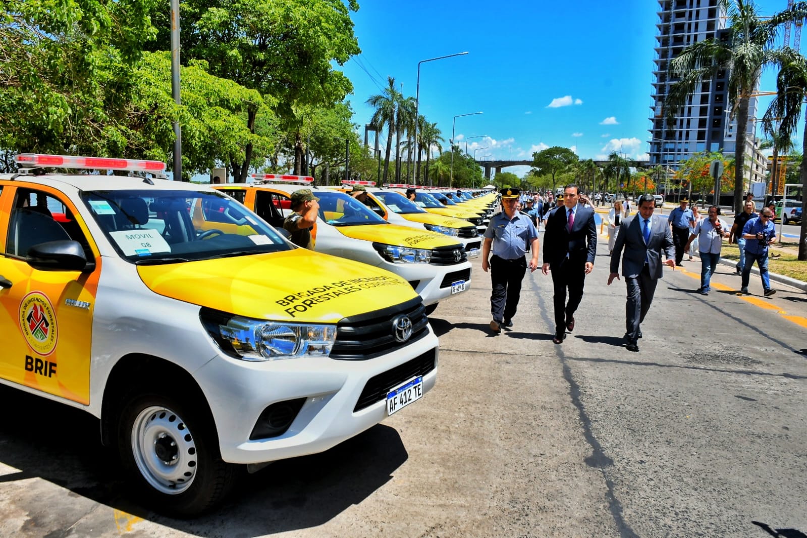 Gustavo Valdés presidió esta mañana la presentación de cinco brigadas forestales y entrega de 100 vehículos a Bomberos de la Policía y de las distintas asociaciones afines del Interior, como así también ocho camiones, dos autobombas y equipamiento de ataque rápido contra incendios. El acto tuvo lugar sobre la Costanera Sur de Capital.