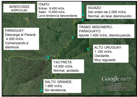 En Corrientes/Barranqueras podría observarse acotadas oscilaciones en respuesta al derrame de Yacyretá. Asimismo, las medias semanales se encuentran aproximadamente 0,10 m por encima del promedio de noviembre de los últimos 25 años en Corrientes y Barranqueras y muy similar al mismo en Goya.